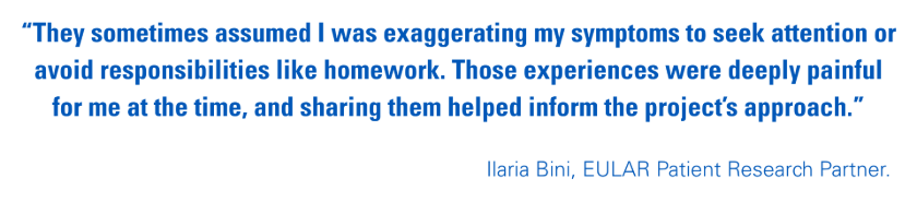 Ilaria: My dual perspective as both a patient and a psychologist allowed me to offer unique insights into the transition process and the psychological factors involved. I drew on my experiences as a child and adolescent, when my pain was often misunderstood or dismissed by adults. They sometimes assumed I was exaggerating my symptoms to seek attention or avoid responsibilities like homework. Those experiences were deeply painful for me at the time, and sharing them helped inform the project’s approach.