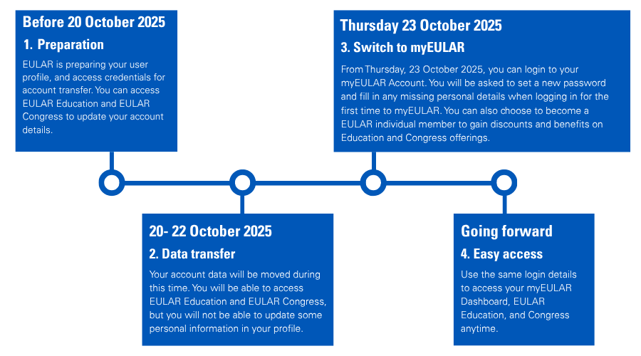 The account transfer to myEULAR, our new membership platform, is taking place during 20-22 October. Any existing account on EULAR platforms will be transferred to myEULAR. Previously, you needed separate logins for each EULAR platform. With myEULAR, you’ll have a single account and password to access everything.